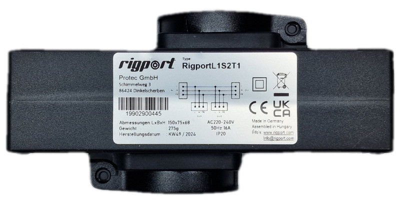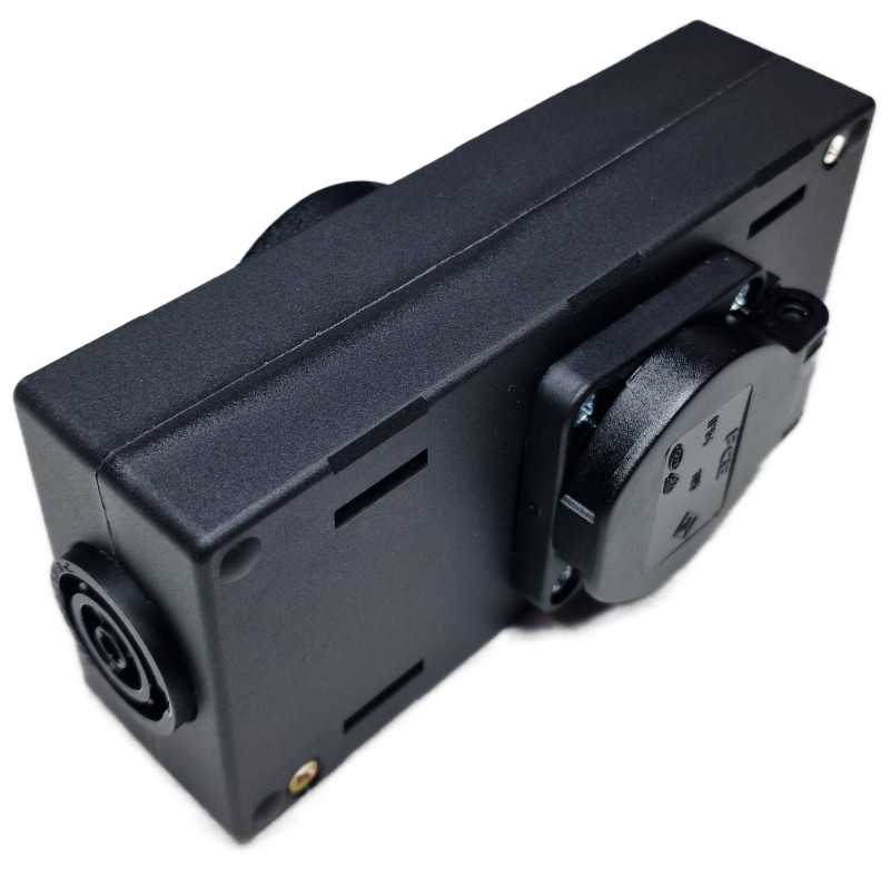 A RigPortL1S2T1 a truss-ra tervezett áramelosztó, eredeti Neutrik powerCON True1 és PCE Schuko csatlakozókkal.